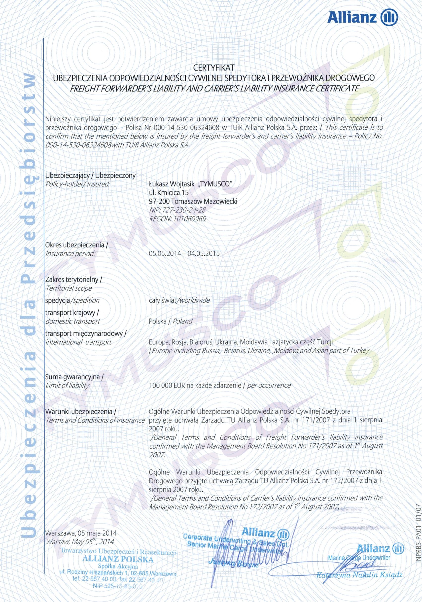 Certyfikat ubezpieczenia Allianz