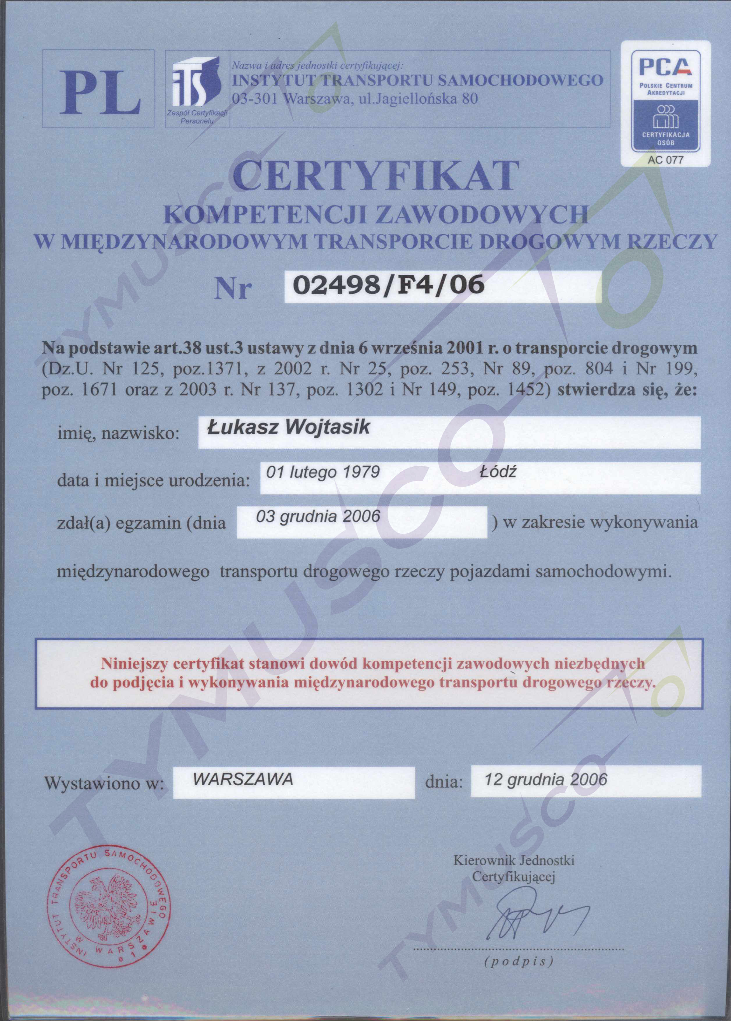 Certyfikat kompetencji zawodowych